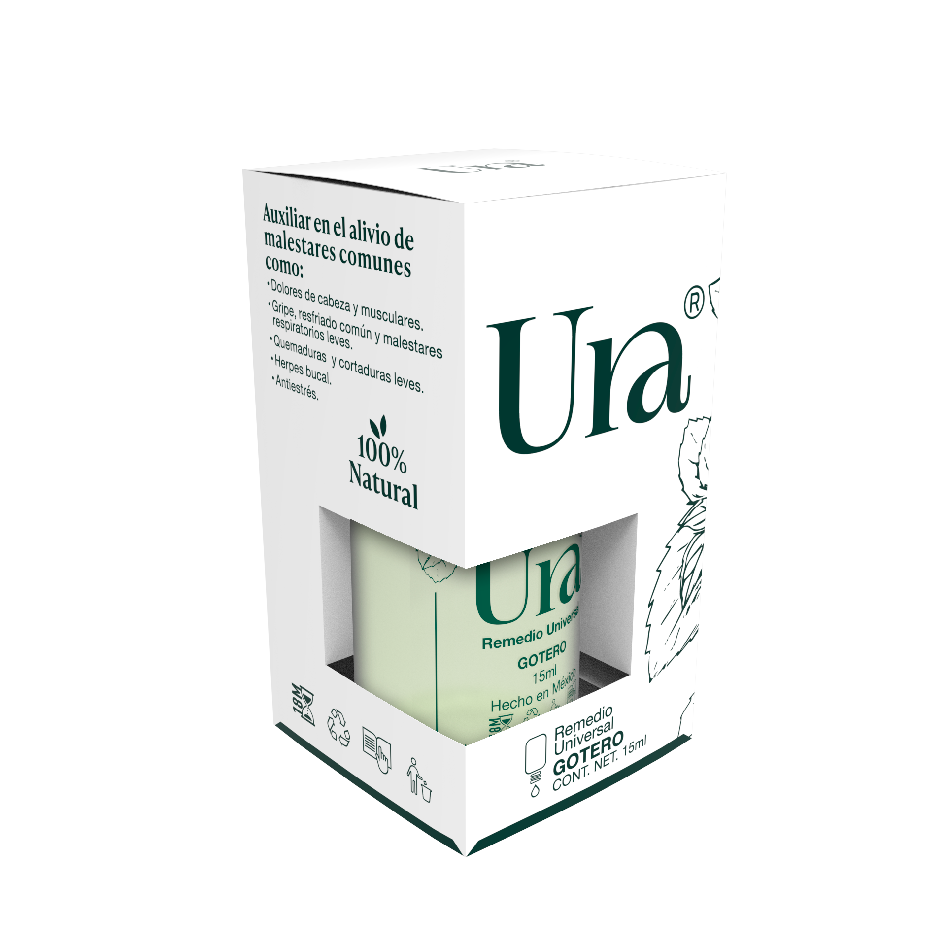 El formato de URA más versátil, permite la aplicación tópica en el área deseada, al igual que permite verter la solución en difusores, vaporizadores o tinas. Recomendado para malestares medios a intensos en mayores de 12 años. Controla su intensidad por la cantidad de gotas.